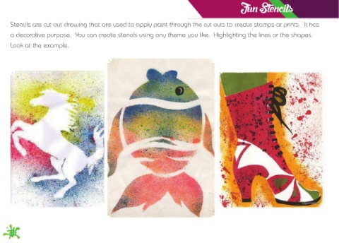 Stencils are cut out drawing that are used to apply paint through the cut outs to create stamps or prints. It has