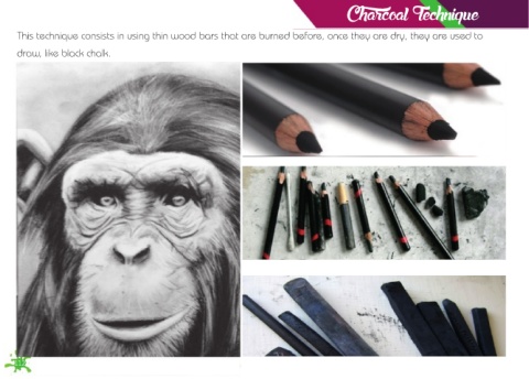 Charcoal Technique This technique consists in using thin wood bars that are burned before, once they are dry, they are used to draw, like black chalk. 112