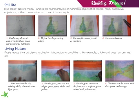 1. Find many elements 2. Define the shapes using 3. Use acrylics, color pencils 4. Use unusal colors.