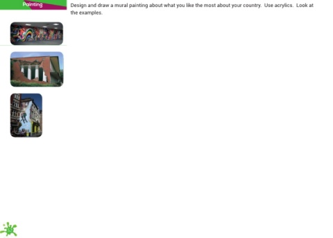 Painting Design and draw a mural painting about what you like the most about your country. Use acrylics. Look at the examples. 52
