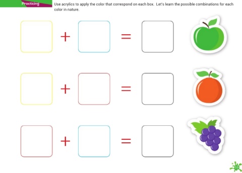 Practicing Use acrylics to apply the color that correspond on each box. Let’s learn the possible combinations for each color in nature. + = + = + = 59