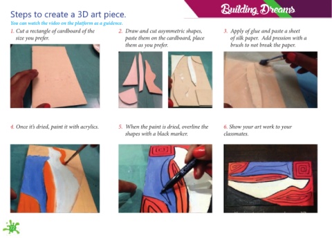 1. Cut a rectangle of cardboard of the 2. Draw and cut asymmetric shapes, 3. Apply of glue and paste a sheet